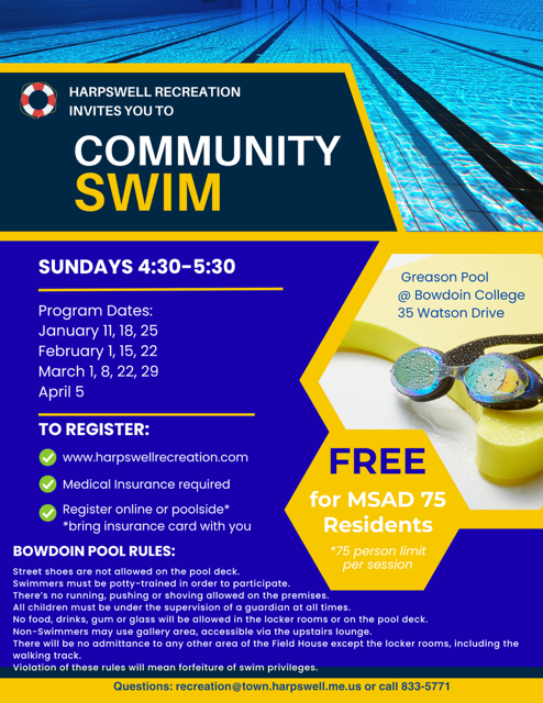 All Bowdoin College Pool rules must be followed by participants while we are in the space.